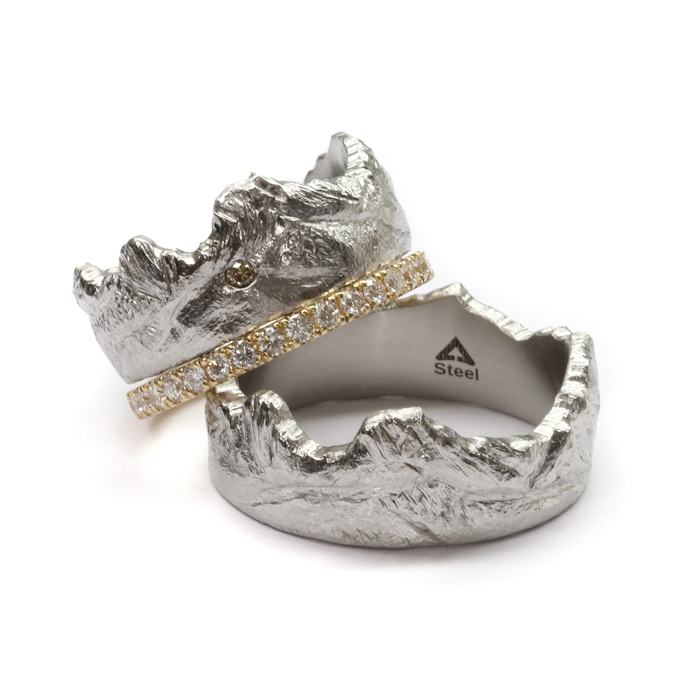 Bergringe mit handgefertigtem Bergrelief. Als schöne Option für den Damenring noch eine feiner Alliancering.