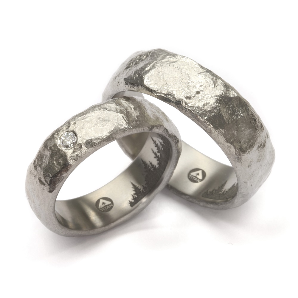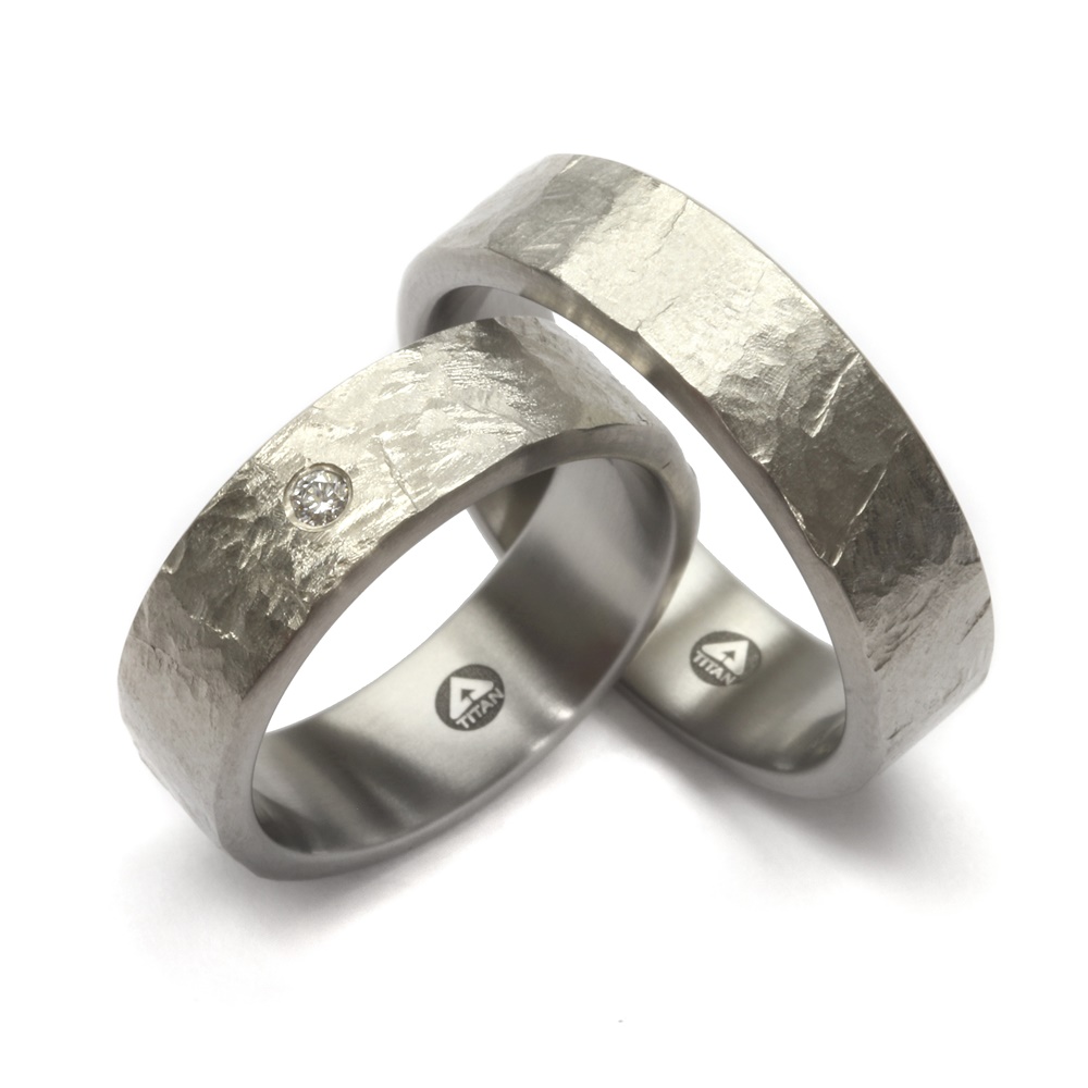 Eheringe mit strukturierter natürlicher Oberfläche. Den Damenring ziert ein Diamant FG-vvs.